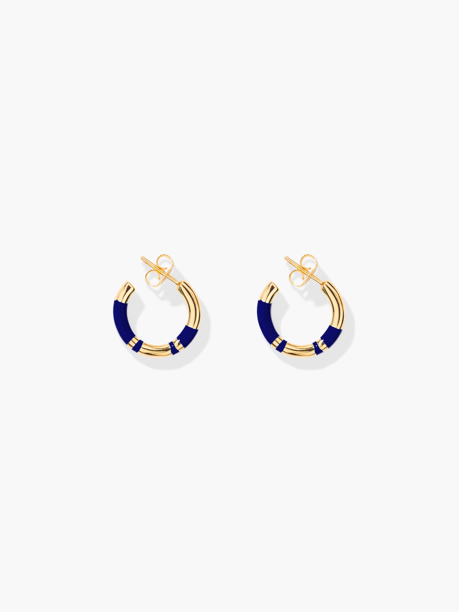 Mini créoles Positano à rayures bleu lapis en résine et dorées à l'or jaune 750/1000.