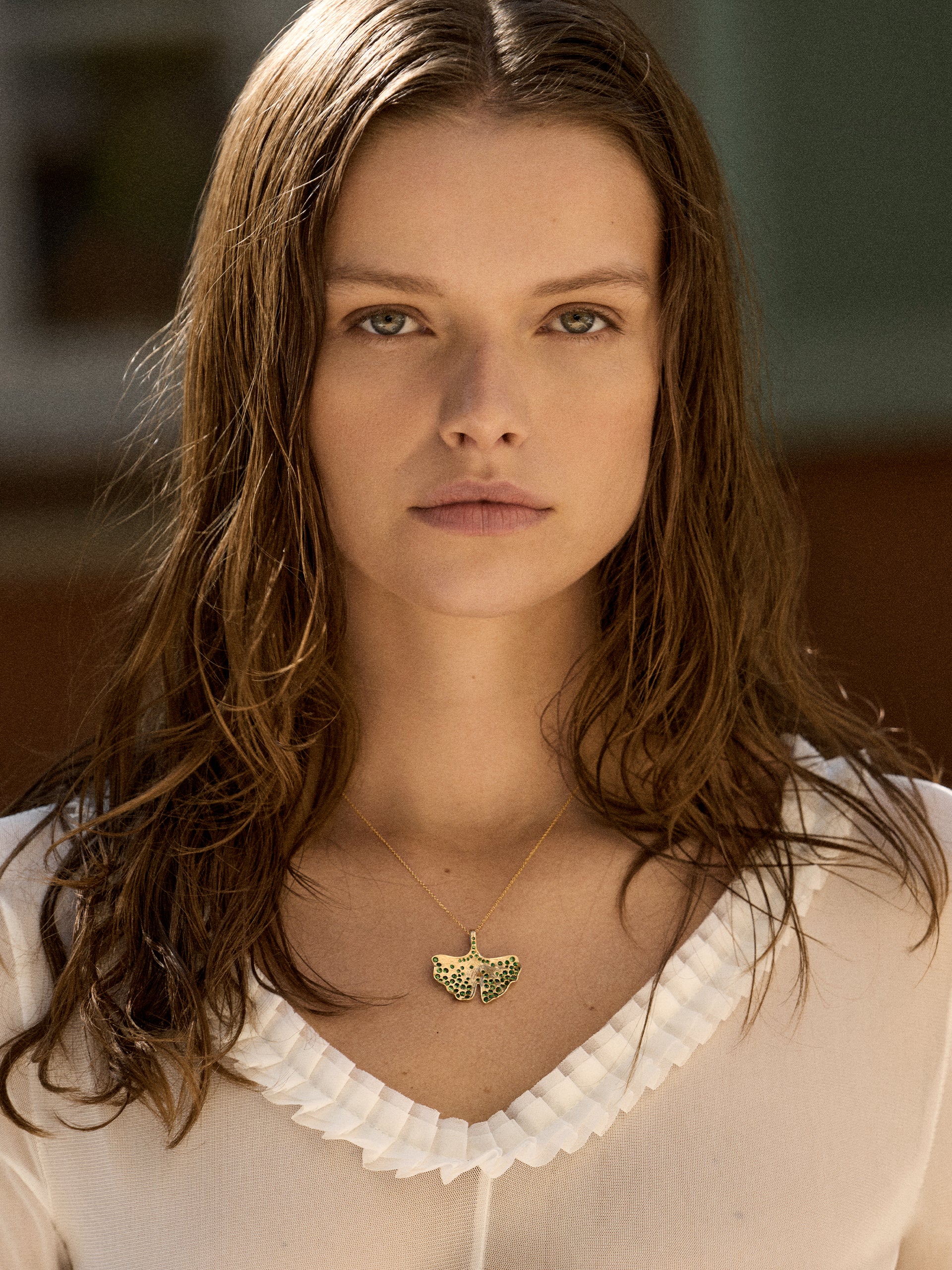 La collection Ginkgo offre une parure en or jaune, reproduisant fidèlement les plus infimes nervures de la feuille, qui vient illuminer le visage et le corps.